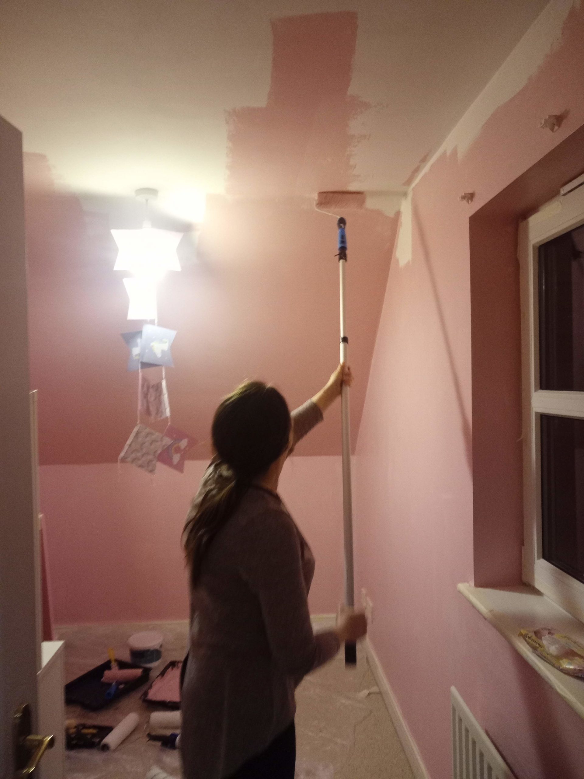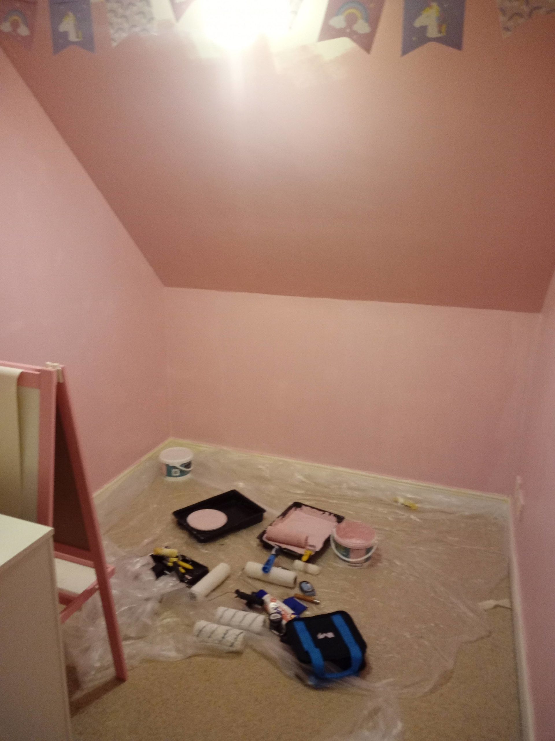 In the playroom, we painted all the walls and the roof pink. the woodwork stayed white. In the bedroom we only painted two walls pink, keeping two walls and the roof (and slope) white.