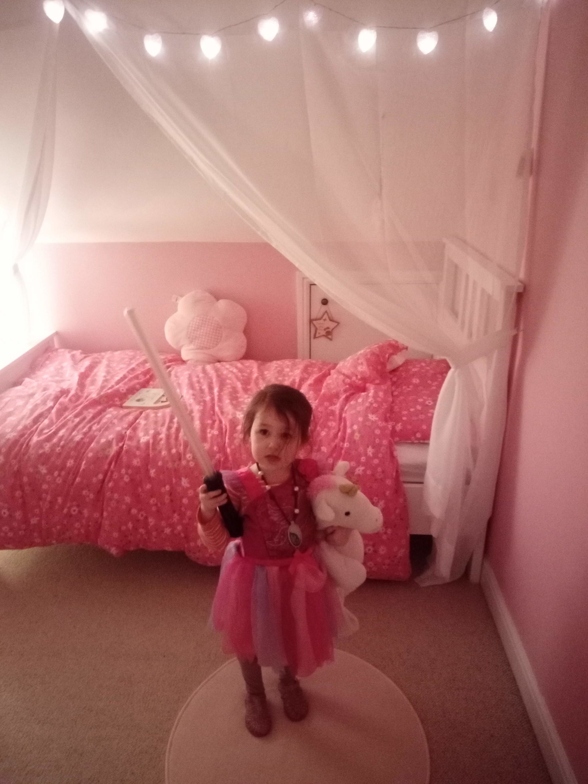 In the bedroom we added lace curtains to drape over the new bed and some heart-shaped LED lights to add some magic.