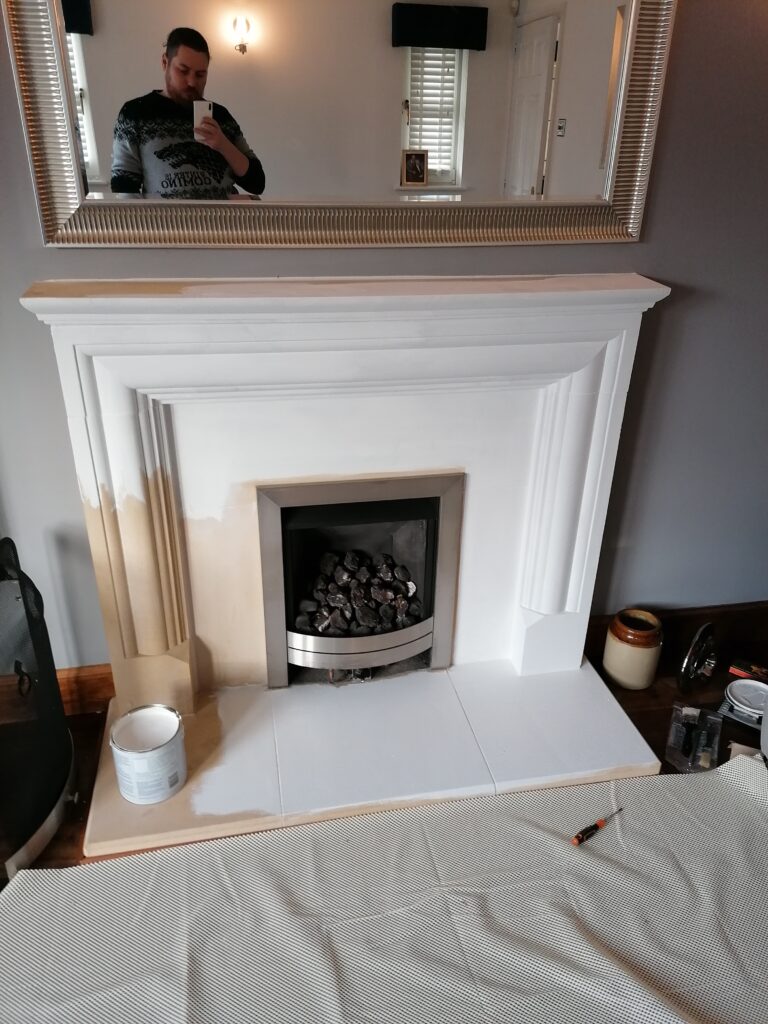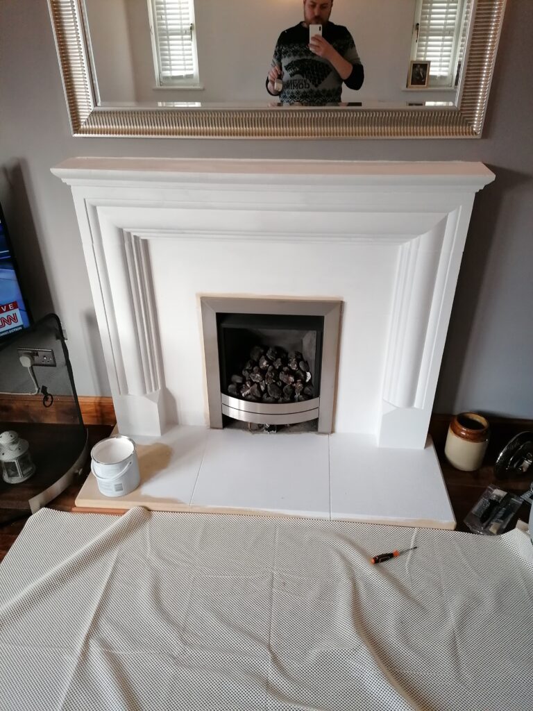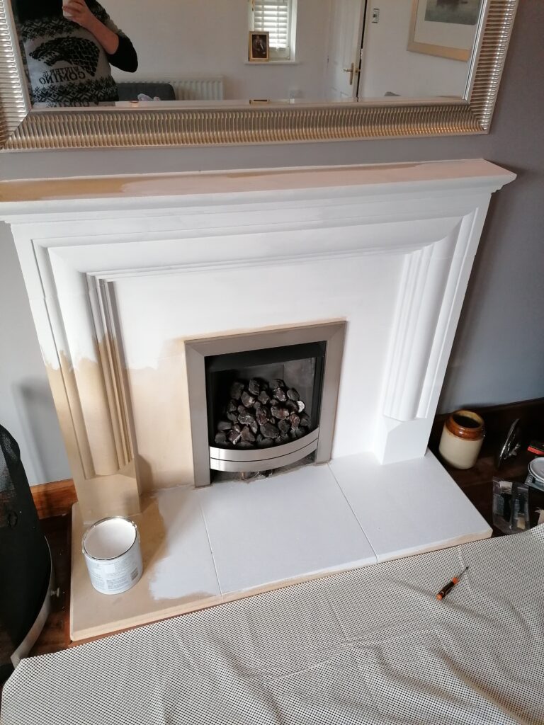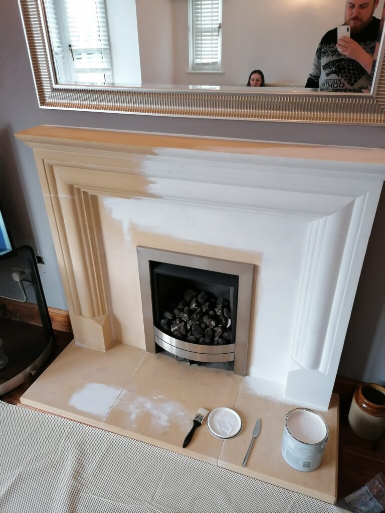 Our fireplace is made from fake stone – almost concrete like, but trying to look and feel like sandstone. Its very nice, but it’s a yellow colour. We decided to paint it, and after a little research found that chalk paint would be best, here are the results