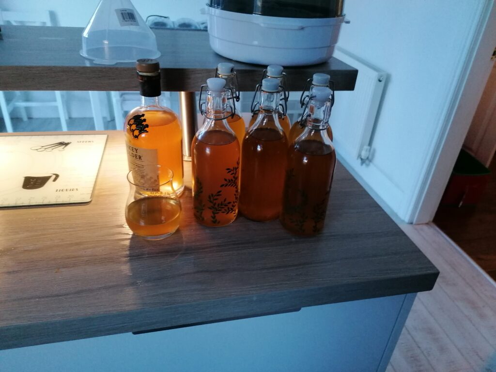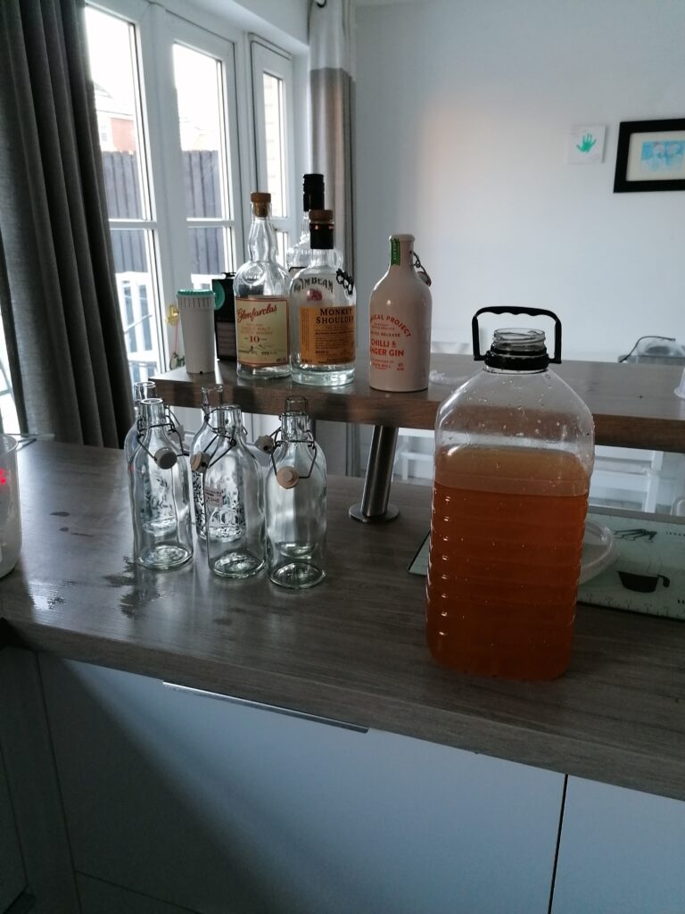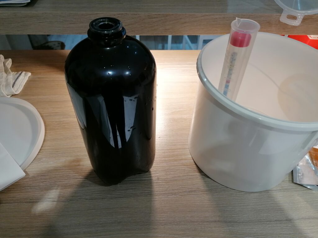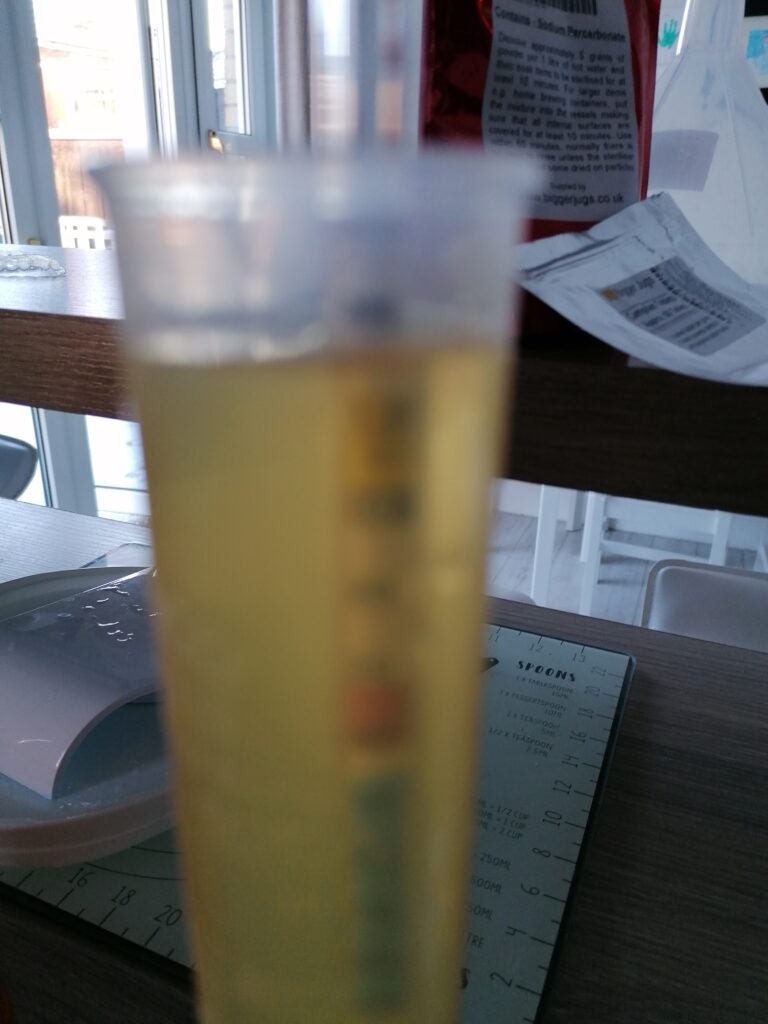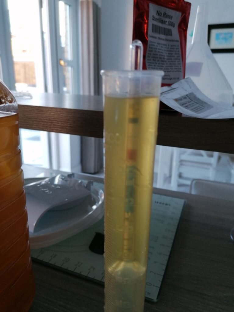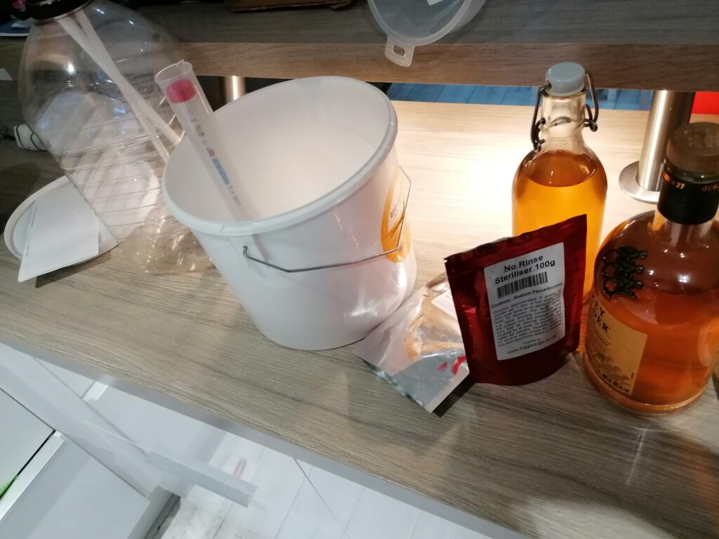 It was very easy to make, just add 5L apple juice to a container, add some sugar (I used an online calculator, but basically poured in 3/4 of a bag of sugar and checked with the hydrometer