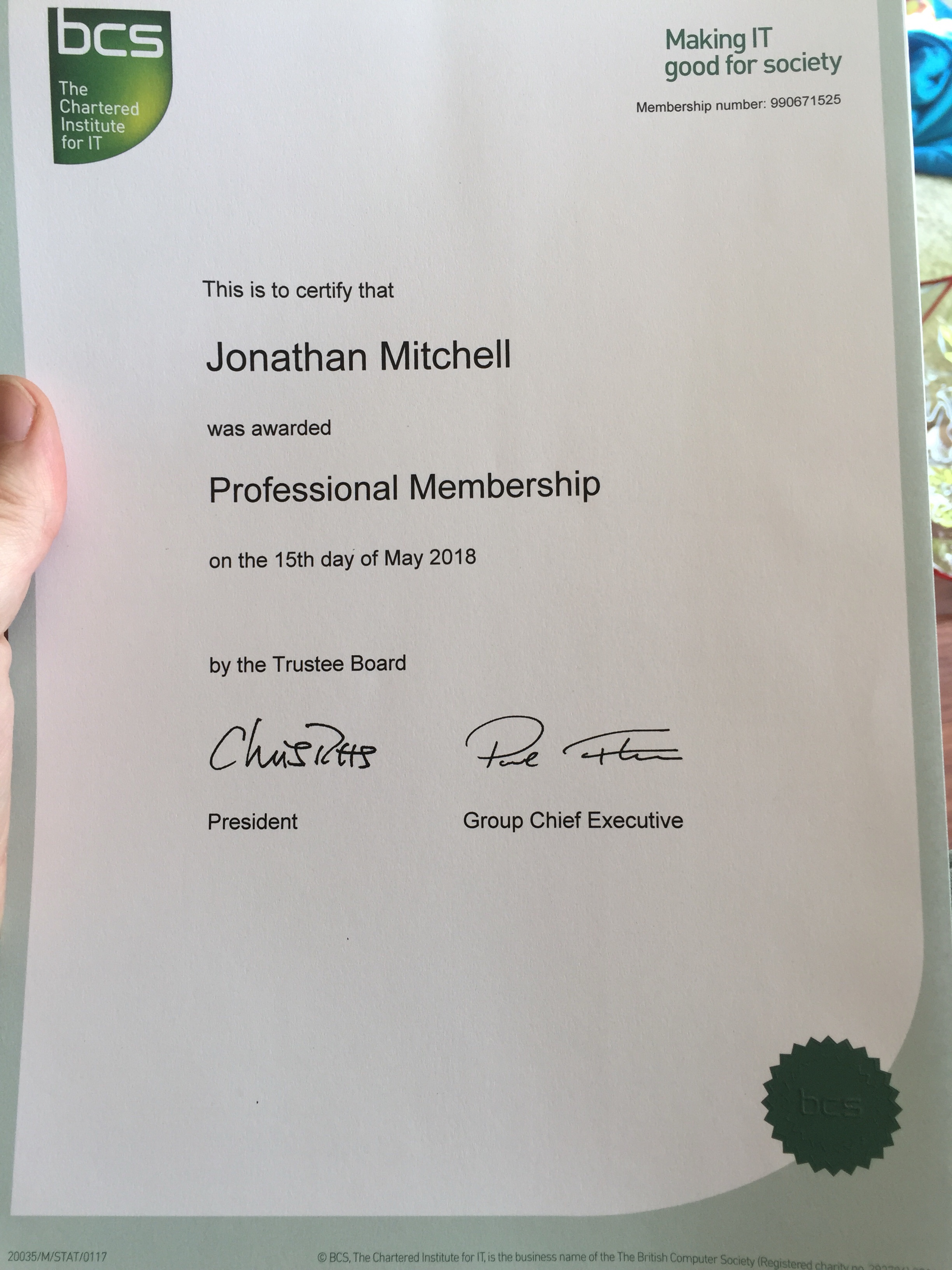 I recently applied for professional membership of the British Computer Society. I was accepted and now can use MBCS after my name :D
