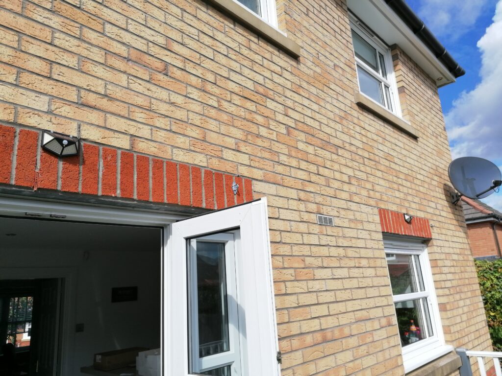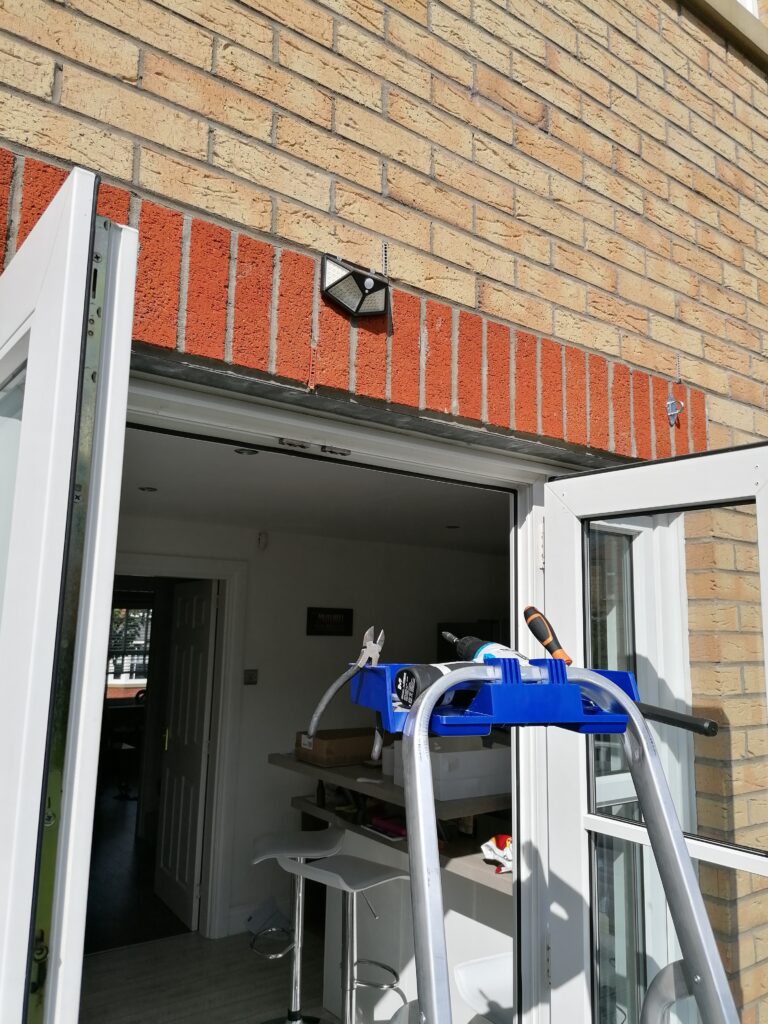 The house had an old school mains powered security light. Time to upgrade to the 21st century with some solar powered lights. The ones I got were basic and from ebay, they have 142 leds per light, and have a ton of lumens each.
